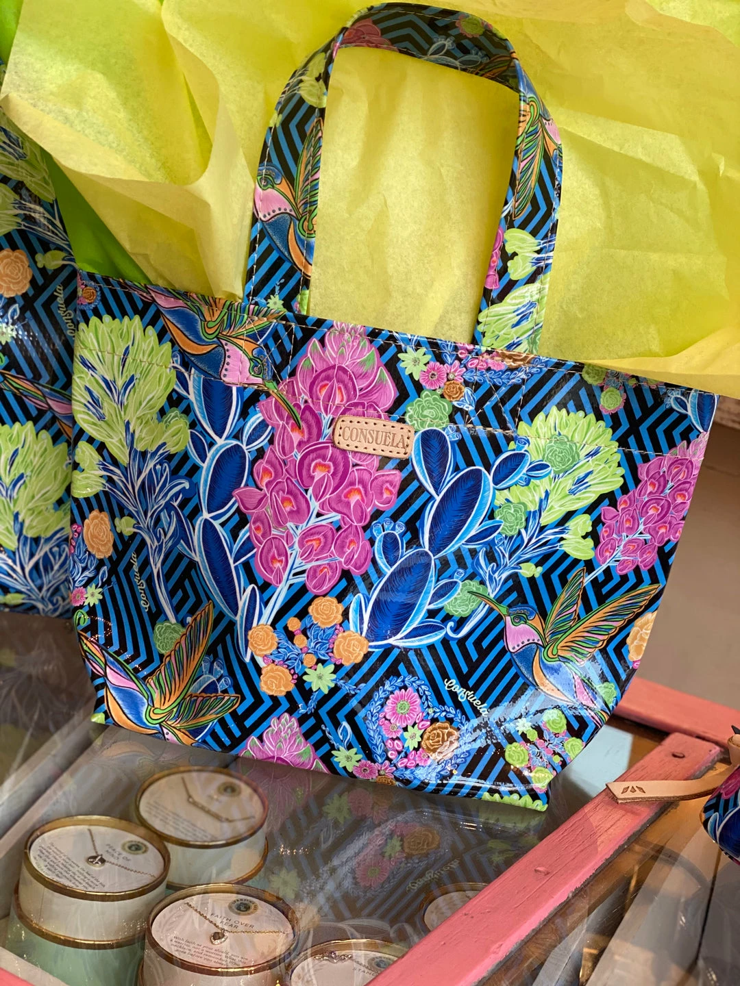 Our jewel Mini Bag is perfect for carrying your lunch or giving gifts and folds easily to fit inside your everyday bag. This unlined utility tote in easy-to-clean ConsuelaCloth™ is the smallest of our Grab-n-Go favorites.Â