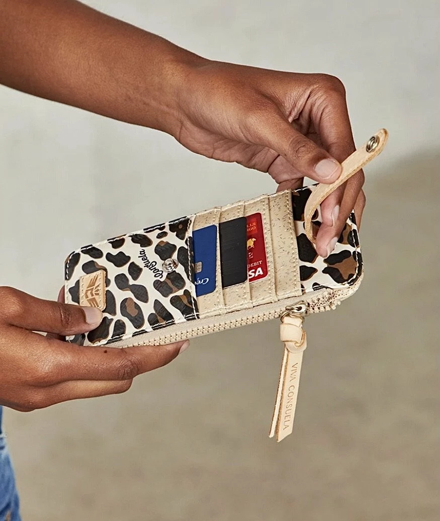 Perfect for a night out or catching a show, this card organizer makes it easy to access your cards, ID and quick cash. A mix of color and print, this card organizer features our Mona ConsuelaCloth™.