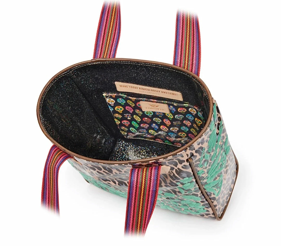 Our trademarked ConsuelaCloth™ is known for its durability, vibrancy, and ease of care. This bag includes our inspirational leather-embossed reminder to “Make Today Ridiculously Awesome.”