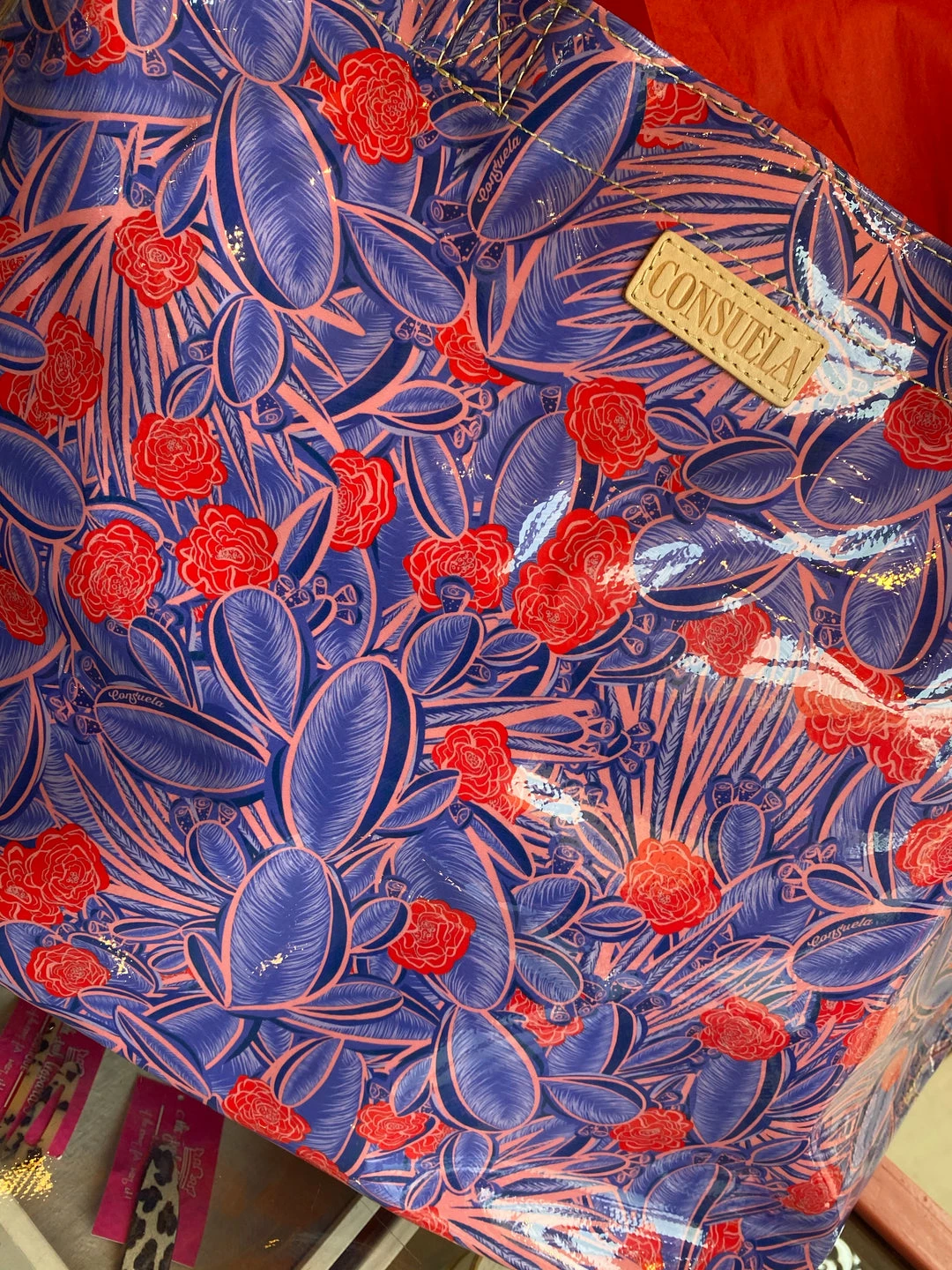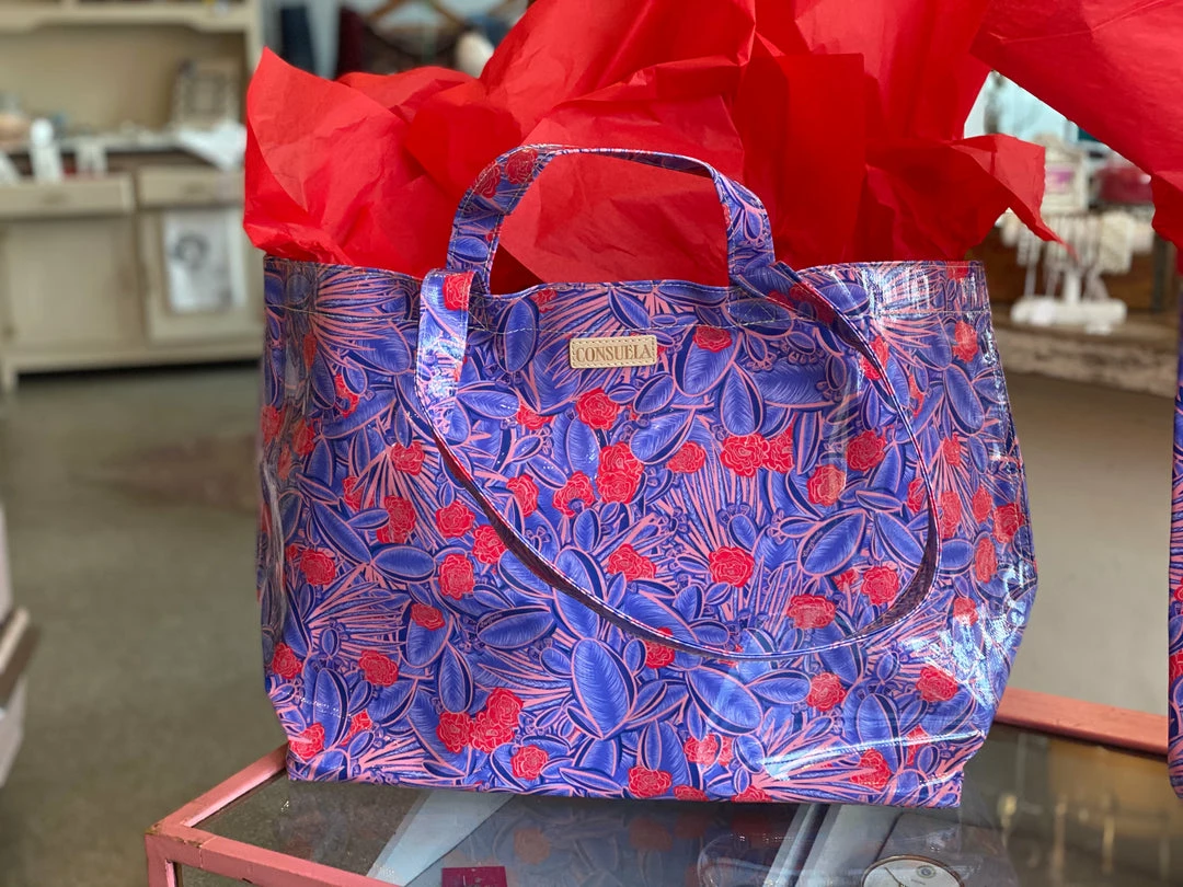 These jumbo unlined utility totes in all-over Leopard Blue Jag ConsuelaCloth™ hold a ton and are easily folded up for storage under your car seat or thrown in the grocery cart.